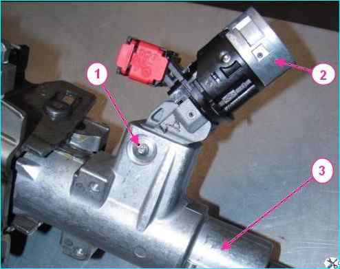 Снятие выключателя зажигания: 1 - болт с отрывной головкой крепления выключателя зажигания; 2 - выключатель зажигания; 3 - вал рулевого управления
