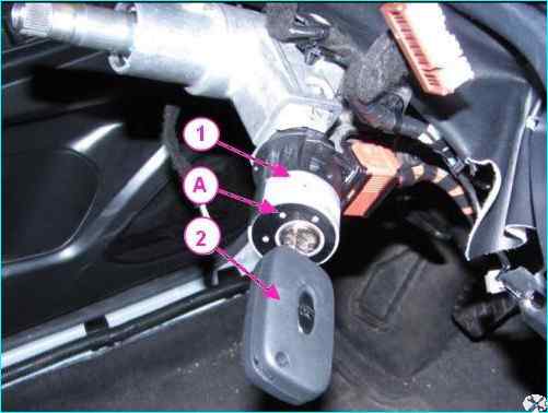 Установить ключ 2, рисунок 2, выключателя зажигания в положение "А", утопить фиксатор 2, рисунок 3, и установить выключатель зажигания в корпус вала рулевого управления.