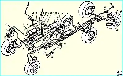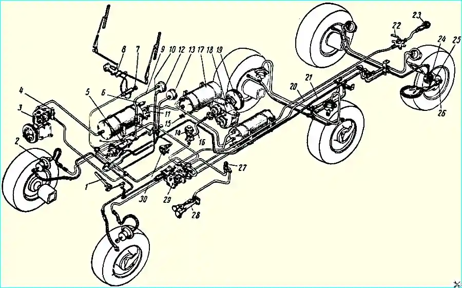 Кран отбора воздуха 11 (см. рис. 3) предназначен для отбора воздуха из воздушных баллонов и находится на правом переднем воздушном баллоне.