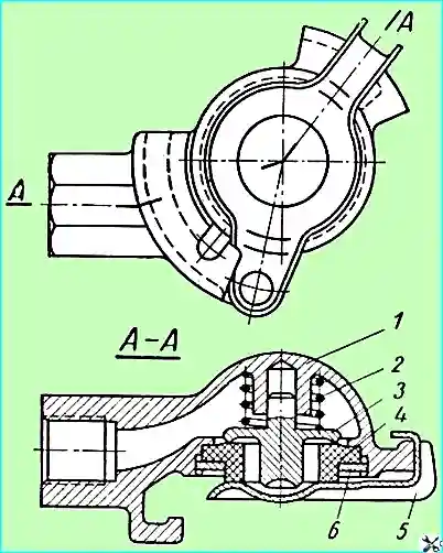 Перед соединением головок тягача и прицепа следует открыть крышку 5, нажать на клапан 3 и, повернув рукоятку разобщительного крана.