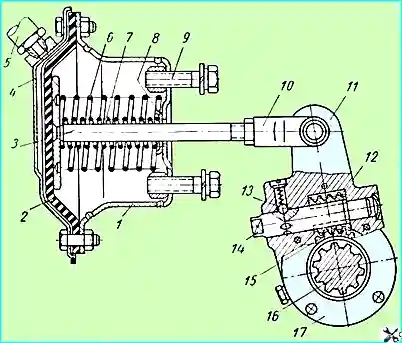 Шток 3 тормозной камеры при помощи вилки 10 и пальца соединен с регулировочным рычагом 11 разжимного кулака тормоза.