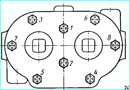 Гайки шпилек, крепящих головку, следует затягивать равномерно, в два приема, в порядке, указанном на рис. 2.