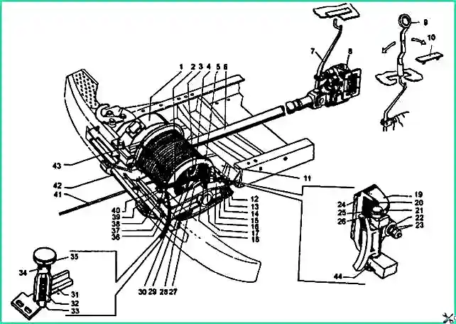 Лебедка автомобиля ЗИЛ-131: 1 - редуктор лебедки; 2 и 31 - вилка включения барабана; 3 - гайка скобы крепления троса, 4 - скоба крепления троса; 5 - барабан; 6 - карданный вал, 7 - рычаг управления коробкой отбора мощности; 8 - коробка отбора мощности; 9 - накидной ключ, 10 - крышка люка пола кабины; 11 - кронштейн крепления лебедки к поперечине; 12,15, 25, 37, 38 - болты; 13 - задняя поперечина установки лебедки; 14, 23 и 36 - гайки; 16 - траверса вала барабана; 17 - переходник; 18 и 30 - масленки; 19 - колодка тормоза; 20 - винт; 21 - палец вилки крепления барабана, 22 - направляющая нажимного болта; 24 - фрикционная накладка колодки тормоза; 26 - нажимная пружина колодки тормоза; 27 - упорное кольцо барабана, 28 - передняя поперечина установки лебедки; 29 - скользящая муфта включения барабана, 32 - пружина фиксатора, 33 - фиксатор вилки включения барабана; 34 - штифт, 35 - рукоятка вилки включения барабана; 40- пластина запора фиксатора, 41 - трос лебедки с крюком; 42 - направляющий ролик; 43 - предохранительная скоба; 44 - шплинт
