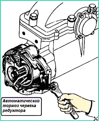 Отвернуть болты крепления крышки автоматического тормоза редуктора лебедки, снять крышку с манжетой 17 в сборе и упорную шайбу.