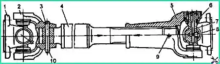Карданный вал привода лебедки: 1 - фланец; 2 - вилка карданного вала: 3 - предохранительный штифт: 4 - вал со шлицевым концом; 5 - скользящая вилка кардана лебедки; 6 - подшипник крестовины кардана; 7 - крестовина кардана; 8 - пробка; 9 - пресс-масленка; 10 - шплинт
