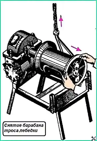 Перед разборкой следует очистить лебедку от грязи и пыли, промыть в обезжиривающем растворе и обдуть сжатым воздухом. Разборку лебедки проводят в исключительных случаях, так как она работает непостоянно и детали ее интенсивного износа не имеют.