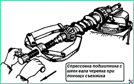 Спрессовать с вала червяка внутренние кольца подшипников с помощью съемника мод. 20П-7968 (рис.6).