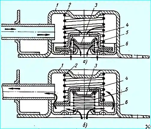 Клапанная коробка топливного бака: (а) - впускной клапан в открытом положении при разряжении в баке; (б) - выпускной клапан в открытом положении при избыточном давлении в баке; 1 - корпус клапанов; 2 пружина выпускного клапана; 3 - впускной клапан; 4 - выпускной клапан; 5 - пружина впускного клапана; 6 - дно клапанов
