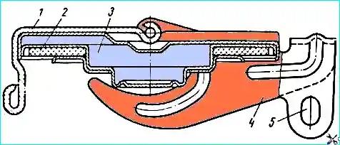 Пробка бака: 1 - облицовка пробки; 2 - резиновая прокладка; 3 - корпус; 4 - рычаг пробки бака; 5 - отверстие для запирания пробки на горловине