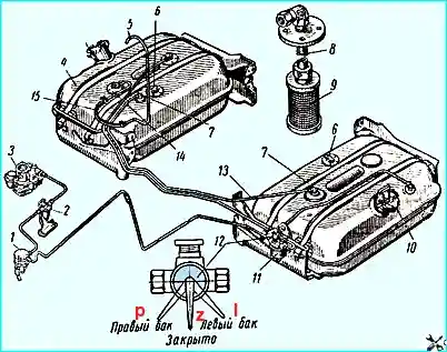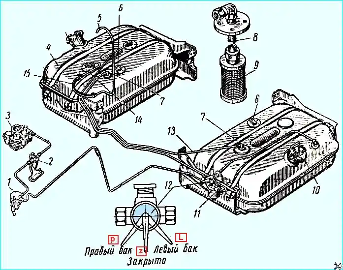 Схема системы питания: 1 - топливный насос; 2 - фильтр тонкой очистки топлива; 3 - карбюратор; 4 - топливный бак (дополнительный); 5 - воздухоподводящая трубка; 6 - датчики указателей уровня топлива в баках; 7 - угольники; 8 - приемная трубка; 9 - сетчатый фильтр; 10 - пробка; 11 - фильтр-отстойник; 12 - кран; 13 - соединительная трубка баков; 14 - клапанная коробка бака: 15 - резиновый шланг; (P) - правый бак; (L) - левый бак; (Z) - закрыто