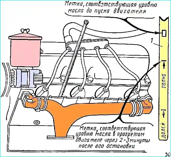 Метка «Полно» показывает нормальный уровень масла в картере двигателя, прогретого до рабочей температуры, через 2—3 мин после остановки.