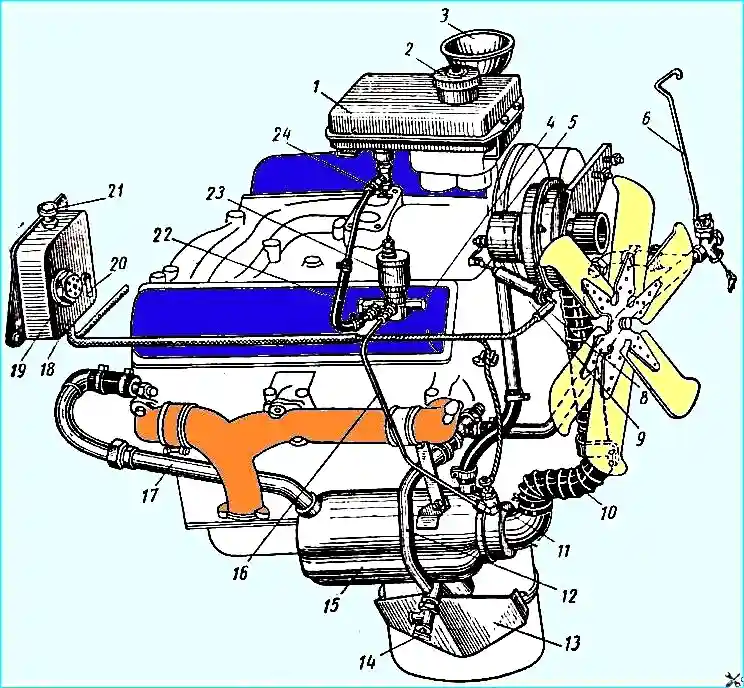 Подогреватель: 1 - топливный бачок; 2 - пробка бачка; 3 - наливная воронка; 4 - регулировочная игла; 5 - электродвигатель с вентилятором; 6 - ручка управления краном; 7 - сливной кран трубопровода; 8 - соединитель проводов; 9 – конденсатор; 10 - шланг подвода воздуха; 11 - свеча накаливания; 12 - отводящая трубка от двигателя к котлу; 13 - лоток; 14 - сливной кран котла; 15 - котел подогревателя; 16 - трубка от электромагнитного клапана; 17 - подводящая трубка от котла к двигателю; 18 управления; 19 - контрольная спираль; 20 - выключатель свечи; 21 - ручка переключателя; 22 - трубка топливного бачка; 23 - электромагнитный клапан; 24 - кран