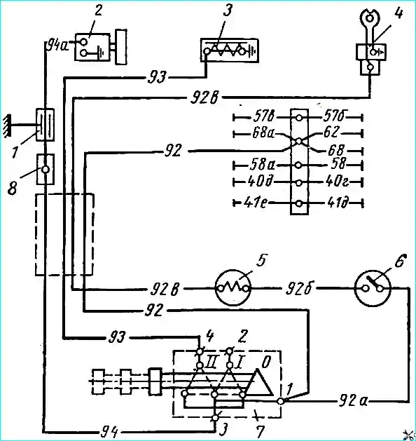 Схема пульта управления подогревателем (Дополнение к схемам электрооборудования): 1 - конденсатор; 2 - электродвигатель вентилятора подогревателя; 3 - катушка электромагнитного клапана; 4 - свеча накаливания; 5 - контрольная спираль; 6 - выключатель свечи; 7- переключатель; 8 - соединитель (цифры с 92 по 94, включая цифры с буквенными обозначениями, написанные более мелко, указывают номера проводов схем)