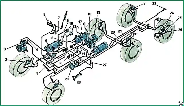 Система регулирования давления воздуха в шинах (см. рис. 1) состоит из крана 5 управления давлением с клапаном-ограничителем падения давления; головок 24 подвода воздуха к шинам колес, шинных кранов 26 запора воздуха, воздушного манометра 13 трубопроводов.
