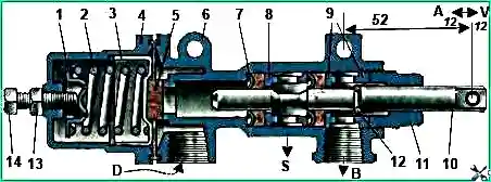 Перед соединением золотника10 крана с тягой рычага управления необходимо золотник устанавливать так, чтобы размер от отверстия в золотнике под соединительный палец до ближайшего болта был равен 52 мм (рис. 2).