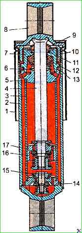 При износе или повреждении штока, поршня, рабочего цилиндра, клапанов необходимо заменить амортизатор в сборе.