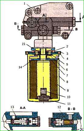 Предохранительный клапан 13 фильтра отрегулирован на давление 0,25÷0,35 МПа и служит для поддержания необходимого давления масла в главной масляной магистрали.