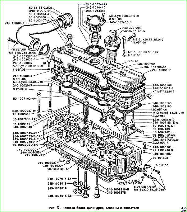 На головке цилиндров сверху устанавливаются стойки, ось коромысел с коромыслами, крышка головки, впускной коллектор и колпак крышки, закрывающий клапанный механизм.