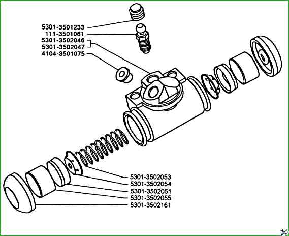 Детали сборки цилиндра тормозного механизма заднего колеса ЗИЛ-5301 по каталогу