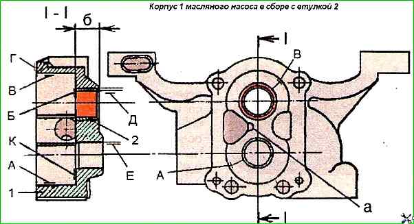 Величина местного износа поверхности «Б» корпуса масляного насоса в местах, сопрягаемых с нагнетающими шестернями, допускается до 0,03 мм.