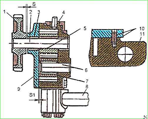 Утопание торца пальца ведомого зубчатого колеса относительно плоскости разъема корпуса насоса (S1) должна быть в пределах 0,7-1,3 мм (рис. 3).