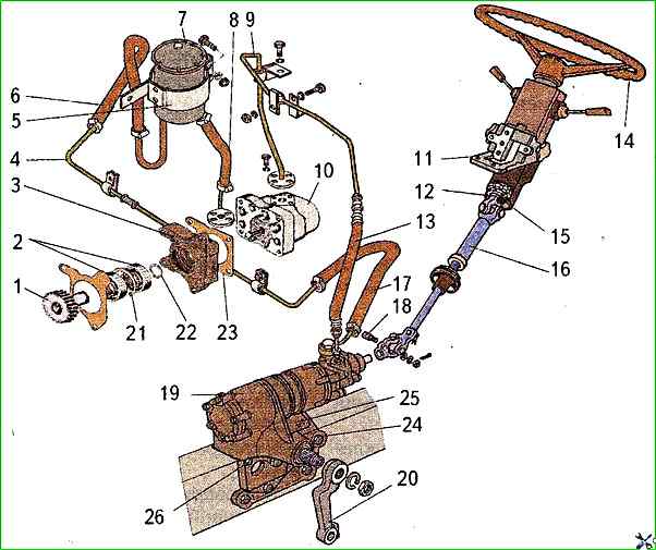 Для разборки привода гидравлического насоса надо снять с помощью круглогубцев упорное кольцо 22 (рис. 3) и выпрессовать с помощью гидравлического пресса шестерню 1 вместе с подшипником.