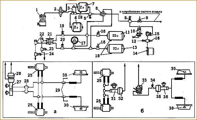 Схема тормозного привода автомобиля ЗИЛ-5301: а - вариант для автомобилей выпуска до июля 2001г.; б - вариант с контурами, разделенными по мостам (с июля 2001г.); 1 - компрессор; 2 - регулятор давления пневмопривода; 3 - влагомаслоотделитель; 4 - регенерационный баллон; 5,8, 12, 23, 24, 33 и 34 - клапаны контрольного вывода; 6 - тройной защитный клапан; 7 компенсационный баллон; 9 - одинарный защитный клапан; 10 - кран стояночной тормозной системы; 11 и 13 - воздушные баллоны; 14 – пружинный энергоаккумулятор привода стояночной тормозной системы; 15 - клапан быстрого оттормаживания; 16 - пневмоэлектрические датчики падения давления; 17 - двухстрелочныи манометр рабочей тормозной системы; 18 - краны слива конденсата из воздушных баллонов; 21 - двухсекционный кран рабочей тормозной системы; 22 - выключатели сигнала торможения; 25 - скоба с гидроцилиндрами тормоза переднего моста; 26 - двухполостная тормозная камера; 27 -двухсекционный главный тормозной цилиндр; 28 - сигнальное устройство; 29 - регулятор давления гидропривода; 30 -рабочие гидроцилиндры тормоза заднего, моста; 31 - главный тормозной цилиндр передней оси; 32- пневмокамера передней оси; 33 - регулятор тормозных сил пневмопривода; 35 - пневмокамера колес заднего моста; 36 – главный тормозной цилиндр колес заднего моста.