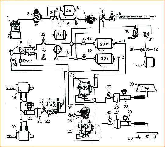 Схема тормозного привода автобуса и автомобилей ЗИЛ-5301 с АБС: 1-компрессор;2 -регулятор давления пневмопривода; 3 - влагомаслоотделитель; 4 - регенерационный баллон; 5, 15, 32, 33, 34, , 35, 36, 37, 38, 39 и 40 - клапаны контрольного вывода; 6 - компенсационный баллон; 7 - краны слива конденсата; 8 - тройной защитный клапан; 9 - одинарный защитный клапан; 10 - кран стояночной тормозной системы; 11 и 13 - воздушные баллоны; 12 - пневмоэлектрические датчики падения давления; 14 - пружинный энергоаккумулятор привода стояночной тормозной системы; 16 - двухстрелочный манометр рабочей тормозной системы; 17 - двухсекционный кран рабочей тормозной системы; 18 - выключатели сигнала торможения; 19 - скоба с гидроцилиндрами тормоза переднего моста; 20 - главный тормозной цилиндр передней оси; 21 - пневмокамера передней оси; 22 - модулятор передней оси; 23 - регулятор тормозных сил; 24 - модулятор правого колеса заднего моста; 25 - модулятор левого колеса заднего моста; 26 - пневмокамера правого колеса заднего моста; 27 - пневмокамера правого колеса заднего моста; 28 - главный тормозной цилиндр правого колеса заднего моста; 29 - главный тормозной цилиндр левого колеса заднего моста; 30 - рабочие гидроцилиндры тормоза заднего моста; 31 - клапан быстрого оттормаживания