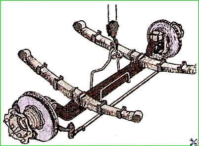 Для демонтажа передней оси с автомобиля надо приподнять автомобиль и установить подставки под балку передней оси, отвернуть гайки крепления колес и снять их.