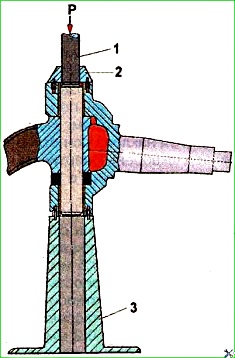 Затем выпрессовать шкворень, использовав для этой цели специальное приспособление.