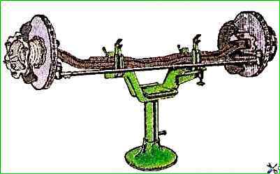 Приподнять автомобиль, снять переднюю ось с подставок и установить ее на стенд мод. 2173 для разборки и сборки передней оси (рис.1).