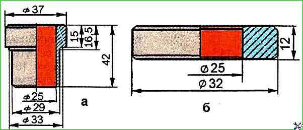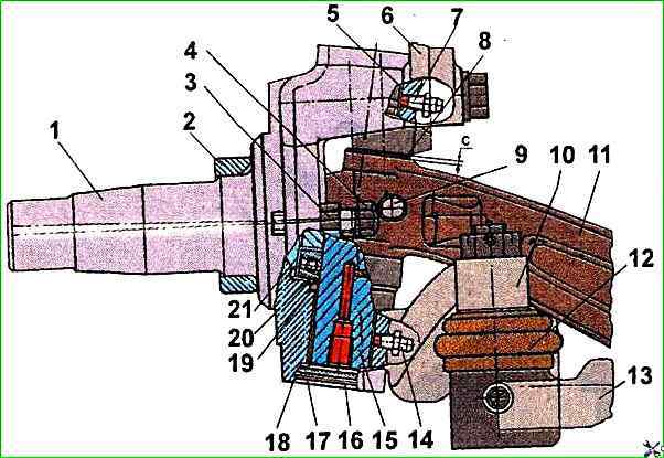 Для снятия поворотного кулака 1 (рис. 6) надо демонтировать круглогубцами упорные кольца 18 и вынуть верхнюю и нижнюю крышки 16 с уплотнительными кольцами 17.