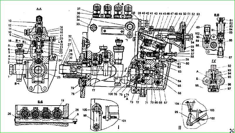 Топливный насос высокого давления: I – вариант однорычажного ТНВД; II – вариант двухрычажного ТНВД; 1 – топливоподкачивающий насос; 2 – втулка ролика-толкателя; 3 – ролик толкателя; 4 – толкатель плунжера; 5 – регулировочный болт толкателя с контргайкой; 6 – нижняя тарелка; 7 – хвостовик плунжера; 8 – пружина плунжера; 9 – рейка; 10 – зубчатый венец; 11 – канал отвода топлива; 12 – пружина; 13 – штуцер; 14 – нагнетательный клапан; 15 – прокладка; 16 – седло нагнетательного клапана; 17 – канал подвода топлива; 18 – втулка плунжера; 19 – стяжной винт; 20 – штифт; 21 – верхняя тарелка; 22 – поворотная гильза плунжера; 23 – крышка; 24 – корпус ТНВД; 25 – кулачковый вал; 26 – гайка рейки; 27 – гайка; 28 – шайба; 29 – шлицевая втулка; 30 - фланец установочный; 31 – шпонка; 32 – пружина; 33 – пробка выпуска воздуха; 34 – футорка; 35 – перепускной клапан; 36 – болт; 37 – зажим; 38, 102 – футорки; 39 – корпус корректора по наддуву; 40 – рычаг пружины; 41 – пружина пускового обогатителя; 42 – палец; 43 – серьга; 44 – пружина регулятора; 45 – тяга рейки; 46 – упор; 47 – крышка корректора по наддуву; 48 – основной рычаг регулятора; 49 – штифт; 50 – втулка; 51 – диафрагма; 52 – тарелка; 53 – крышка корректора по наддуву; 54 – шток; 55 – винт; 56 – болт; 57 – пружина холостого хода; 58 – шток корректора; 59 – регулировочные прокладки; 60 – жесткий упор; 61 – корпус корректора; 62 – скоба; 63 – болт; 64 – пята; 65 – ось промежуточного рычага; 66 – промежуточный рычаг; 67 – корпус регулятора частоты вращения; 68 – ось рычагов; 69 – груз; 70 – муфта регулятора; 71 – регулирующий винт; 72 – ось грузов; 73 – ступица; 74 – упругий привод с резиновыми элементами; 75 – шайба упорная; 76 – стакан подшипника; 77 – пластинчатый фиксатор; 78 – плита крепления насоса; 79 – подшипник; 80 – болт угольника; 81 – рукоятка-гайка; 82 – крышка; 83 – вертикальный цилиндр; 84 – шток; 85 – поршень топливоподкачивающего насоса; 86 – впускной капроновый клапан; 87 – поворотный угольник; 88 – корпус; 89, 96 – пружины; 90 – нагнетательный клапан; 91 – топливопрокачивающий насос; 92 – толкатель; 93 – направляющая втулка; 94 – стержень; 95 – поршень топливопрокачивающего насоса; 97 – упор; 98 – пробка; 99 – рычаг управления подачей топлива; 100 – валик рычага управления; 101 – винт регулировки максимальной частоты вращения; 103 – винт регулировки рычага останова двигателя; 104 – рычаг останова двигателя