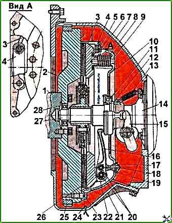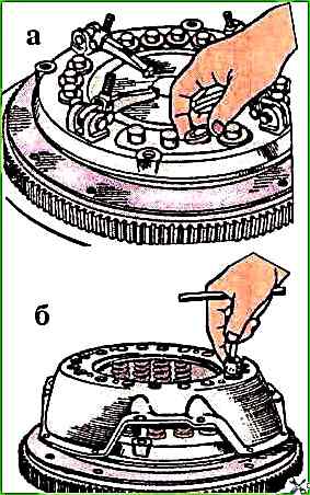 Совместив метки на кожухе и диске, сделанные при разборке для сохранения балансировки, установить кожух сцепления на пружины (см. рис.1д), направив их на выступы на внутренней поверхности кожуха; при этом резьбовые концы опорных вилок должны войти в отверстия кожуха.