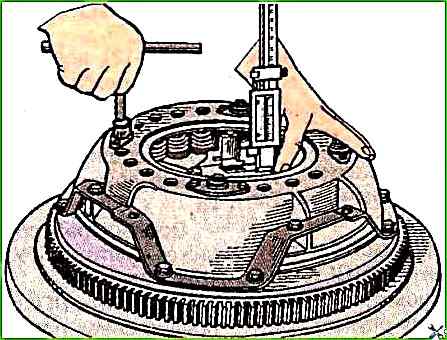 Не снимая собранного нажимного диска сцепления с вспомогательного маховика, используемого как приспособление, надо произвести регулировку положения концов рычагов относительно рабочей поверхности нажимного диска.