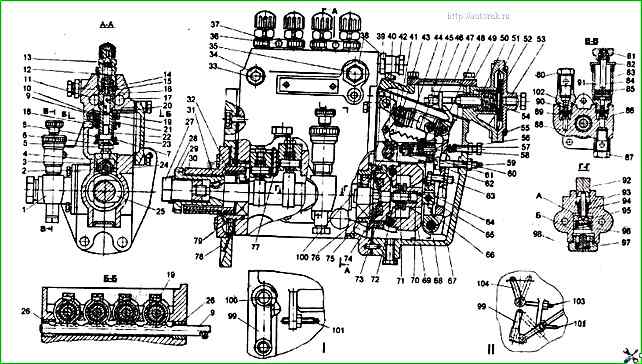 Топливный насос высокого давления: I – вариант однорычажного ТНВД; II – вариант двухрычажного ТНВД; 1 – топливоподкачивающий насос; 2 – втулка ролика толкателя; 3 – ролик толкатель; 4 – толкатель плунжера; 5 – регулировочный болт толкателя с контргайкой; 6 – нижняя тарелка; 7 – хвостовик плунжера; 8 – пружина плунжера; 9 – рейка; 10 – зубчатый венец; 11 – канал отвода топлива; 12 – пружина нагнетательного клапана; 13 – штуцер; 14 – нагнетательный клапан; 15 – прокладка; 16 – седло нагнетательного клапана; 17 – канал подвода топлива; 18 – втулка плунжера; 19 – стяжной винт; 20 – штифт; 21 – верхняя тарелка; 22 – поворотная гильза плунжера; 23 – крышка; 24 – корпус ТНВД; 25 – кулачковый вал; 26 – гайка рейки; 27 – гайка; 28 – шайба; 29 – шлицевая втулка; 30 – фланец установочный; 31 – шпонка; 32 – пружина; 33 – пробка обогатителя; 34 – футорка; 35 – перепускной клапан; 36 – болт; 37 – зажим; 38 и 102 – футорки; 39 – корпус корректора по наддуву; 40 – рычаг пружины; 41 – пружина пускового обогатителя; 42 – палец; 43 – серьга; 44 – пружина регулятора; 45 – тяга рейки; 46 – упор; 47 – крышка корректора по наддуву; 48 – основной рычаг регулятора; 49 – штифт; 50 – втулка; 51 – диафрагма; 52 – тарелка; 53 - крышка корректора по наддуву; 54 – шток; 55 – винт; 56 – болт; 57 – пружина холостого хода; 58 – шток корректора; 59 – регулировочные прокладки; 60 – жесткий упор; 61 – корпус корректора; 62 – скоба; 63 – болт; 64 – пята; 65 – ось промежуточного рычага; 66 – промежуточный рычаг; 67 – корпус регулятора частоты вращения; 68 – ось рычагов; 69 – груз; 70 – муфта регулятора; 71 – регулировочный винт; 72 – ось грузов; 73 – ступица; 74 – упругий привод резиновыми элементами; 75 – шайба упорная; 76 – стакан подшипника; 77 – пластинчатый фиксатор; 78 – плита крепления насоса; 79 – подшипник; 80 – болт угольника; 81 – рукоятка-гайка; 82 – крышка; 83 – вертикальный цилиндр; 84 – шток; 85 – поршень топливопрокачивающего насоса; 86 – опускной капроновый клапан; 87 – поворотный угольник; 88 – корпус; 89 и 96 – пружины; 90 – нагнетательный клапан; 91 – топливопрокачивающий насос; 92 – толкатель; 93 – направляющая втулка; 94 – стержень; 95 – поршень топливопрокачивающего насоса; 97 – упор; 98 – пробка; 99 – рычаг управления подачей топлива; 100 – валик рычага управления; 101 – винт регулировки максимальной частоты вращения; 103 – винт регулировки рычага останова двигателя; 104 – рычаг остановки дизеля