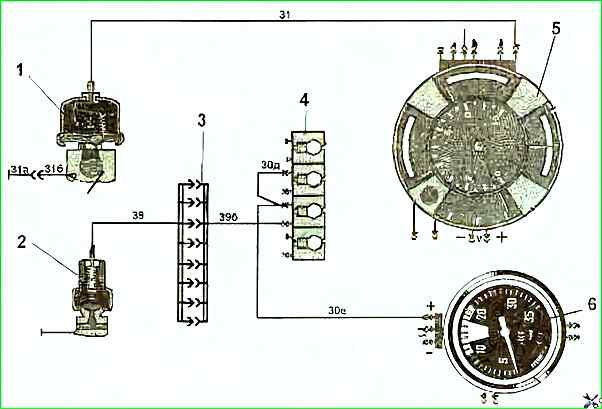 1.- датчик указателя давления масла ММ355; 2 - датчик сигнализатора аварийного давления масла 2602 3829; 3 - соединительная колодка; 4 - сигнализатор падения давления масла 2202.3803-23; 5 - комбинация приборов 36.3801; 6 - тахометр 2541.3813. Цвета проводов: белый — 30Д, 30 е; коричнево-голубой 31; красно-желтый — 39, 39 б; черный — 31а