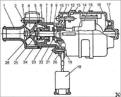 - - отвернуть две гайки 3 и снять крыльчатку 4 насоса, шайбу 26 и пружину 25;