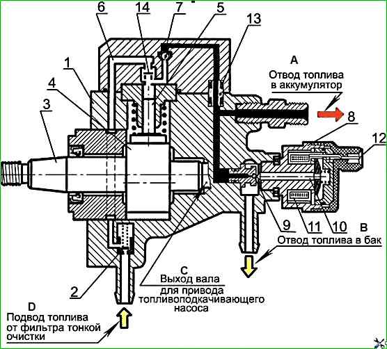 Так как ТНВД рассчитан на большую величину подачи, то на холостом ходу и при частичных нагрузках возникает избыток сжатого топлива, которое через клапан регулирования давления 8 и магистраль обратного слива возвращается в топливный бак.
