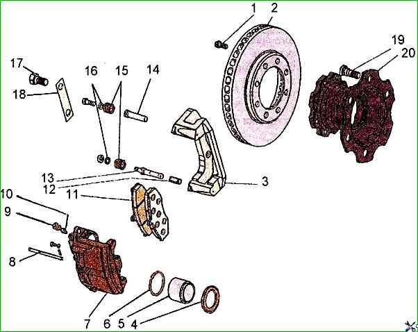 Устройство рабочих тормозов передних колес показано на рис. 1.