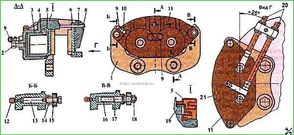 Перед разборкой плавающей скобы тормоза (рис. 2) ее надо тщательно очистить от грязи и промыть, демонтировать с нее хомут 21 крепления шлангов.