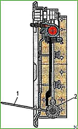 - 4. через отверстие в тормозном щите специальной лопаткой 1 (или широкой отверткой) вращать звездочку регулировочного винта 2 (на левом тормозе снизу вверх; на правом - в обратном направлении), разведя колодки до торможения колеса (не проворачивается от руки).