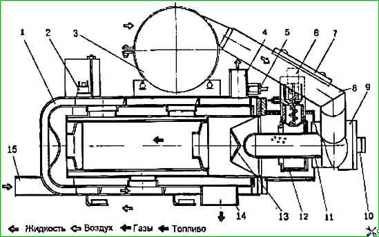 Котел подогревателя (см. рис. 3) представляет собой теплообменник 1 с горелкой 9, электромагнитным топливным насосом и нагнетателем воздуха 3.