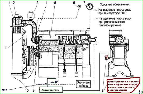 Кран устанавливаем для того, чтобы во время отключения подогревателя и во время работы дизеля перекрыть этот путь жидкости.