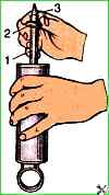 Установить корпус клапана сжатия в тиски и закрепить стержень клапана сжатия.